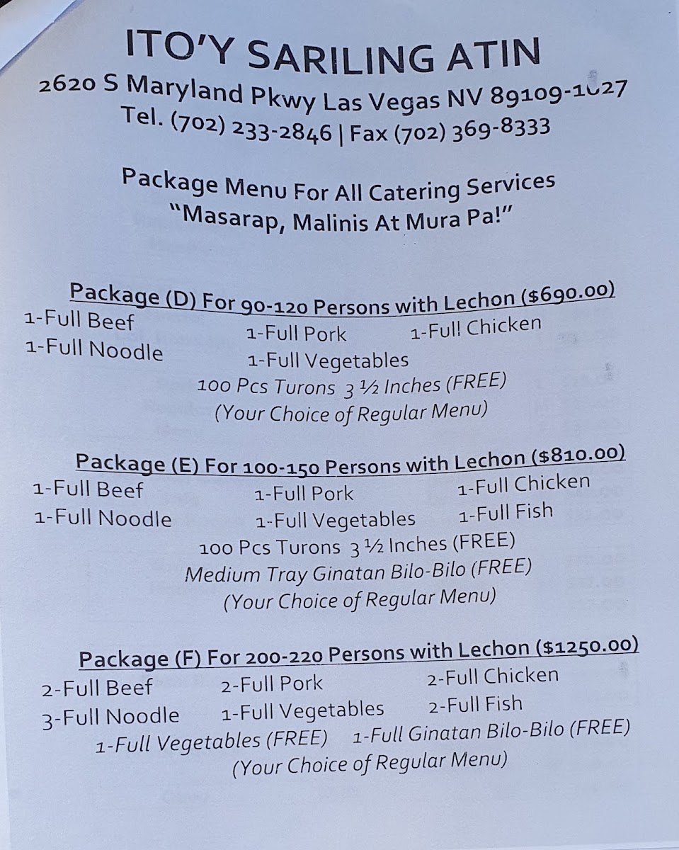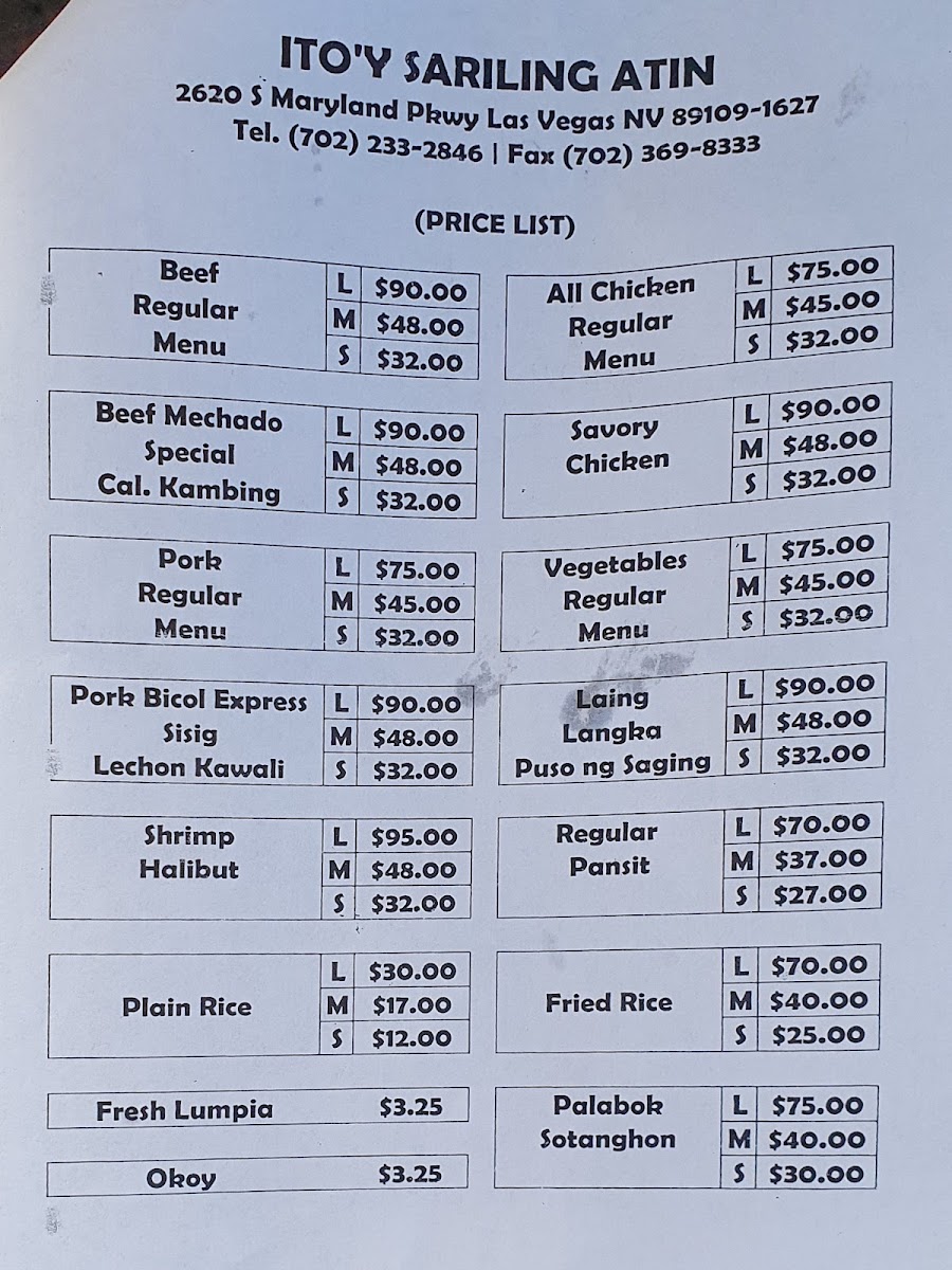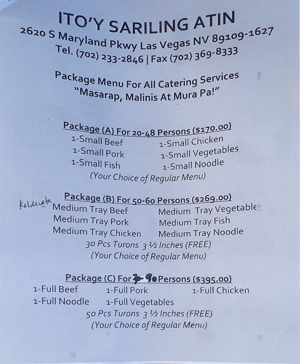 The menu at Itoy Sariling Atin offers a variety of traditional Filipino dishes, featuring a balanced selection of meats, seafood, rice dishes, appetizers, and desserts. It caters to different meal preferences, suitable for breakfast, lunch, or casual dining throughout the day.